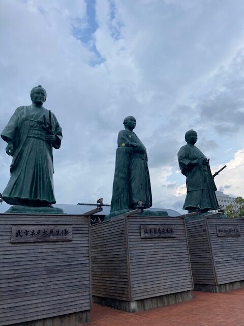 JR高知駅前に、堂々とそびえ立つ三志士。真ん中が竜馬、左が武市、右が中岡慎太郎です。(中岡慎太郎については、次回以降のご紹介で登場する見込みです。)